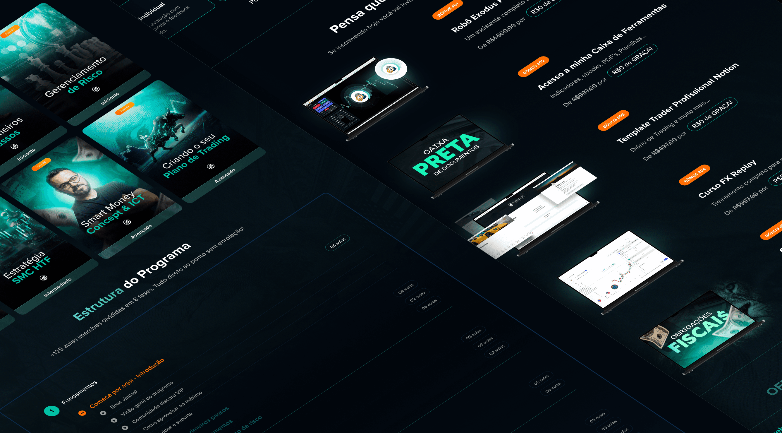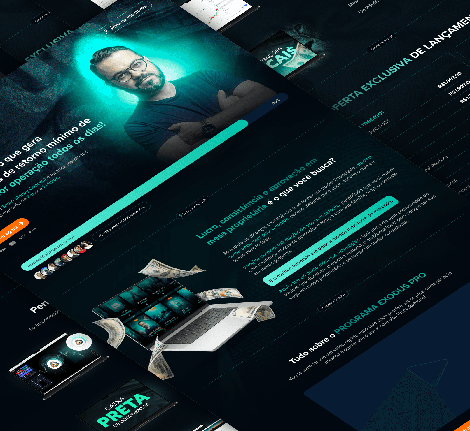 O projeto Exodus Pro foi desenvolvido para posicionar um programa avançado de trading como uma solução estruturada para quem busca consistência, controle de risco e crescimento sustentável no mercado financeiro, especialmente em operações de Forex e Futuros. A proposta visual aposta em uma estética tecnológica e sofisticada, com tons escuros contrastados por verdes e azuis intensos, cores diretamente associadas a dinheiro, performance e confiança. O uso de luzes direcionadas, gráficos implícitos e elementos flutuantes reforça a ideia de precisão, método e domínio técnico, enquanto a presença do especialista em destaque transmite autoridade e credibilidade. A estrutura da página foi pensada para conduzir o usuário por uma jornada lógica e persuasiva, partindo da promessa de risco controlado e retorno consistente, passando por provas sociais, escassez estratégica e clareza da oferta. Os blocos de conteúdo são organizados para facilitar a leitura e reforçar a segurança na tomada de decisão. O resultado é uma página de vendas forte, moderna e altamente estratégica, que posiciona o Exodus Pro como um método profissional para traders que buscam operar com inteligência, disciplina e foco em resultados reais no longo prazo.