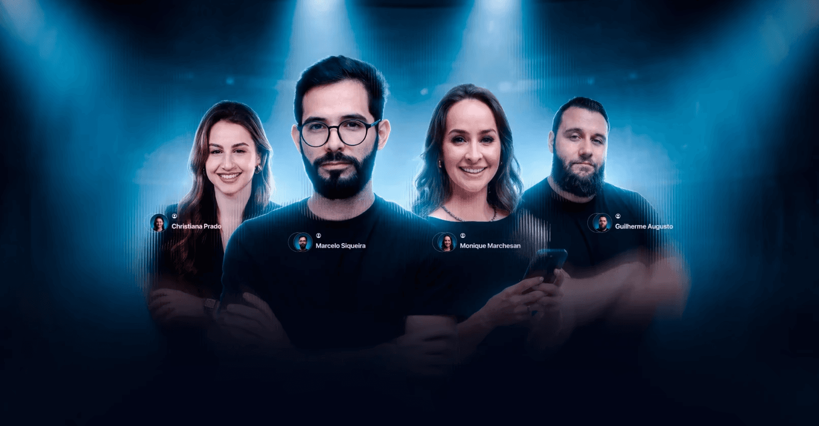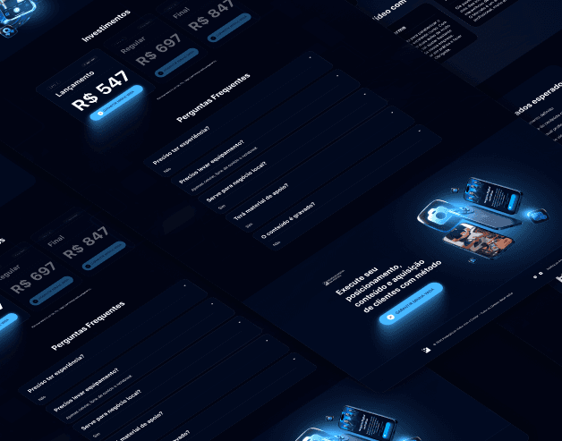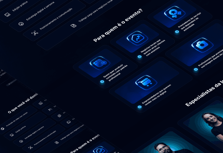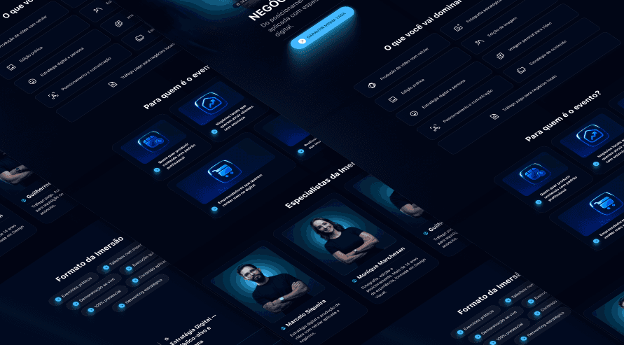 O projeto Negócio Digital na Prática foi desenvolvido para posicionar o treinamento como uma formação estratégica voltada à construção, estruturação e crescimento de negócios digitais com clareza, método e aplicação prática. A proposta visual aposta em uma estética moderna e profissional, com predominância de tons azuis e iluminação de palco, reforçando autoridade, protagonismo e visão de liderança. A presença dos especialistas em destaque cria percepção de equipe multidisciplinar e suporte estruturado, transmitindo confiança e solidez. A composição centralizada e o uso de luz direcionada comunicam foco, clareza e posicionamento, enquanto a identidade visual reforça que o programa vai além da teoria, entregando direcionamento prático para transformar conhecimento em execução. A estrutura do projeto foi pensada para apresentar especialistas, método e proposta de valor de forma clara, conectando experiência, didática e aplicação real no mercado digital. O resultado é uma presença digital forte e institucional, que posiciona o Negócio Digital na Prática como um programa completo para quem deseja sair da intenção e entrar na construção consistente de um negócio online estruturado.