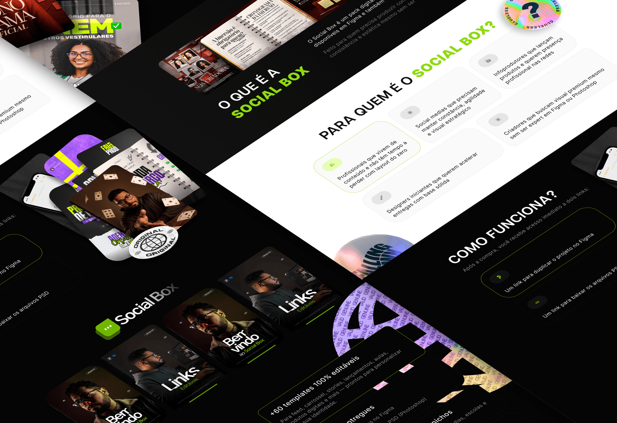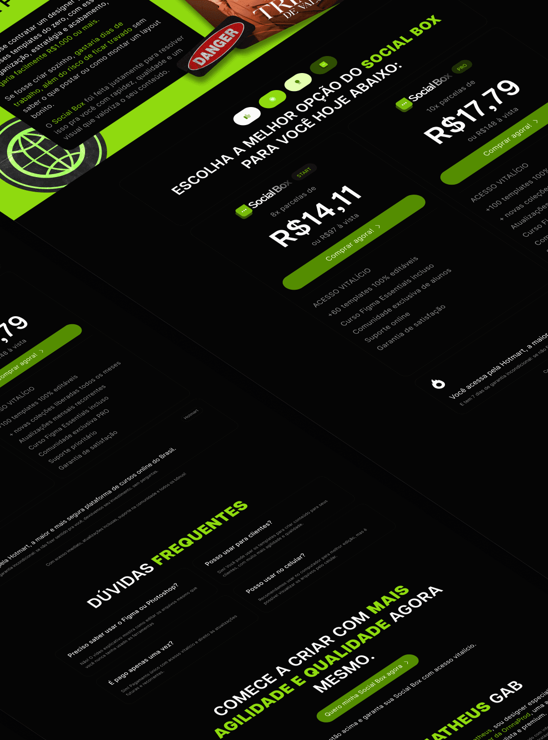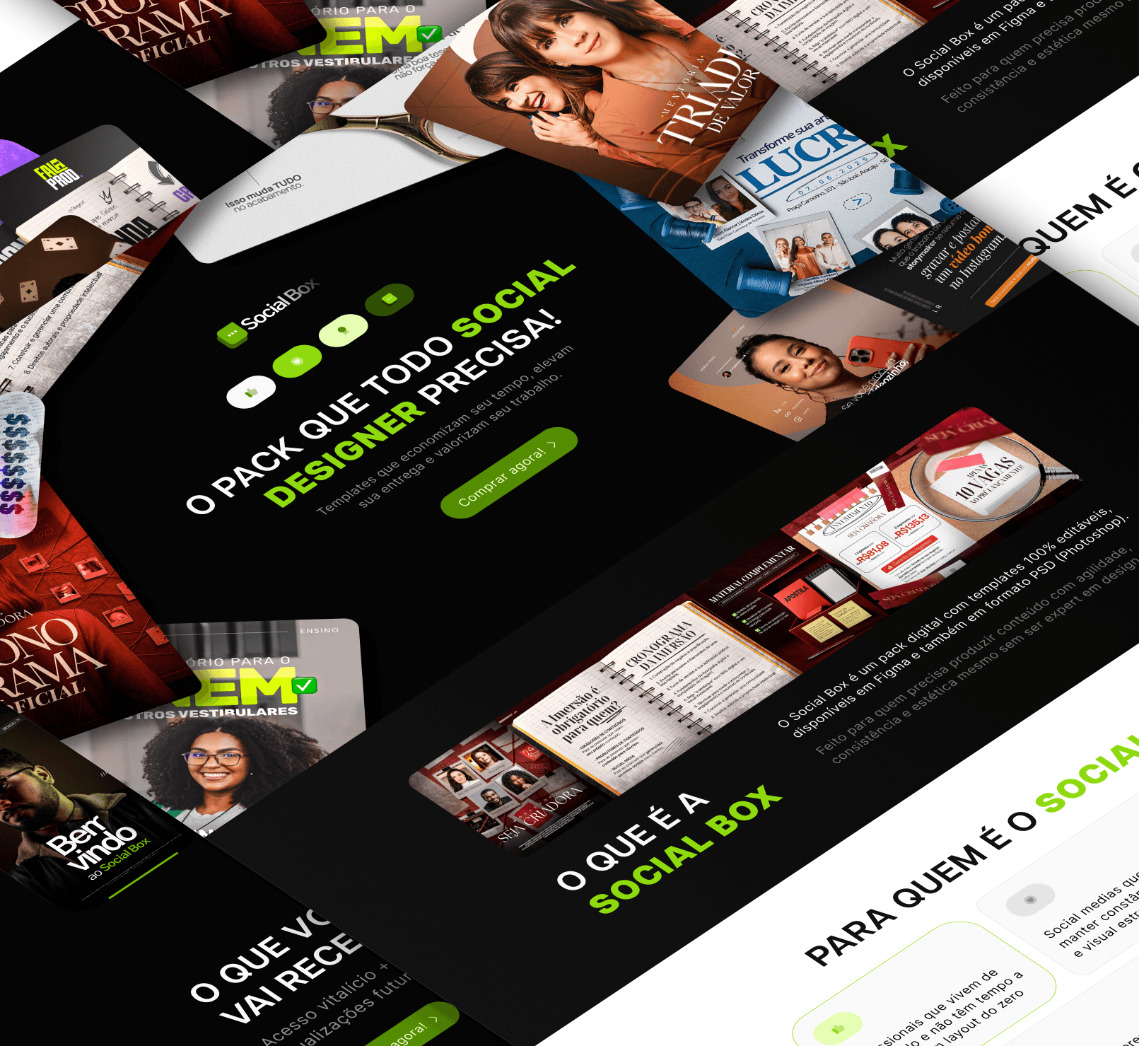 O projeto Social Box foi desenvolvido para posicionar um pack de templates como uma solução prática e estratégica para social designers, criadores e infoprodutores que precisam entregar com consistência, agilidade e estética profissional. A proposta visual aposta em uma estética limpa e contemporânea, com contraste entre fundo escuro e destaques em verde vibrante, transmitindo eficiência, organização e foco em performance. As prévias dos templates em uso reforçam versatilidade e aplicabilidade real, mostrando que o produto funciona em diferentes nichos e estilos de comunicação. A estrutura da página foi pensada para esclarecer rapidamente o valor do produto, explicando o que é, para quem é e como resolve a dor de quem perde tempo criando layouts do zero. Seções objetivas, linguagem direta e CTAs claros conduzem o visitante da curiosidade à decisão com fluidez. O resultado é uma página de vendas simples, funcional e altamente clara, que posiciona o Social Box como um recurso essencial para quem quer produzir conteúdo com mais velocidade, manter padrão visual e valorizar a entrega sem complicar o processo criativo.